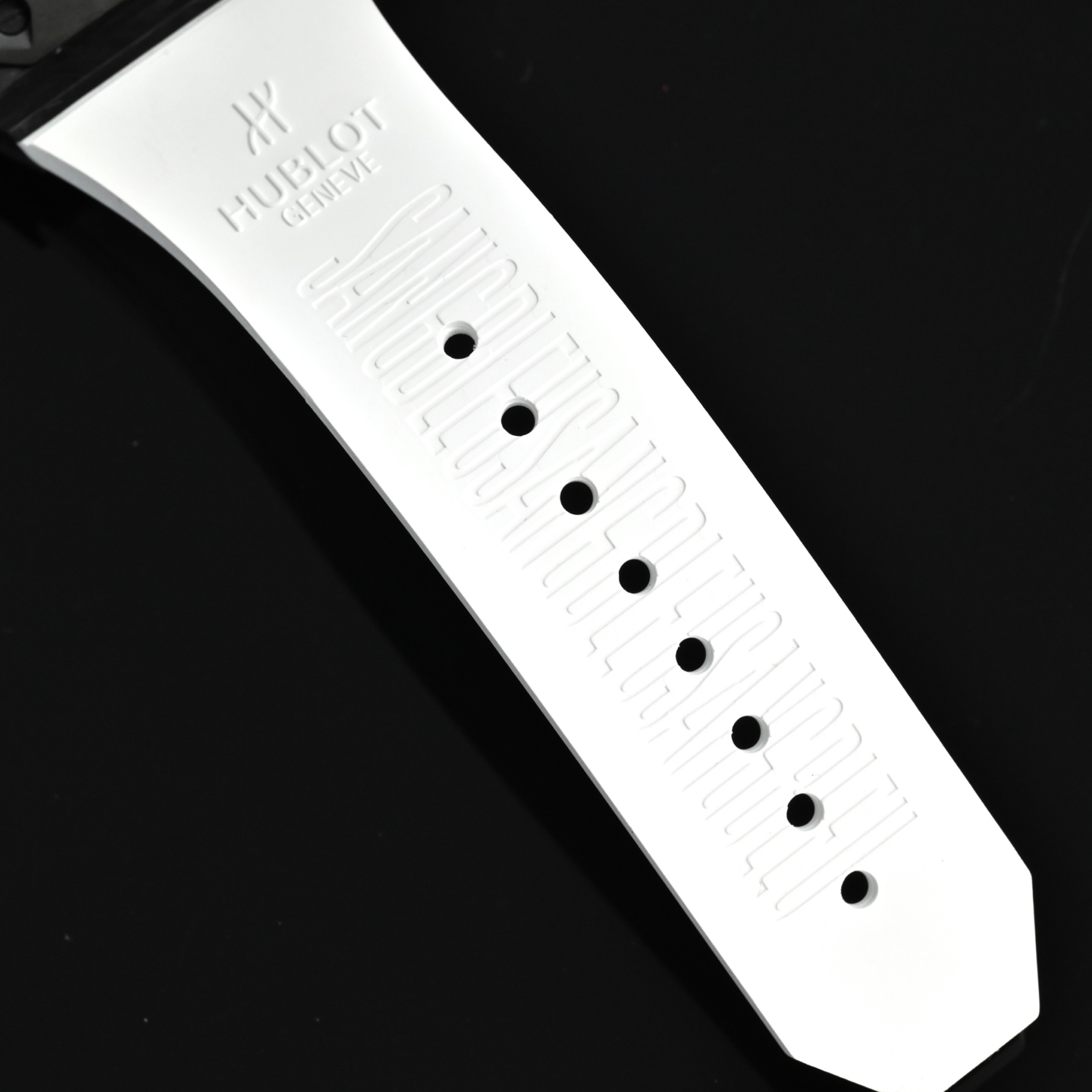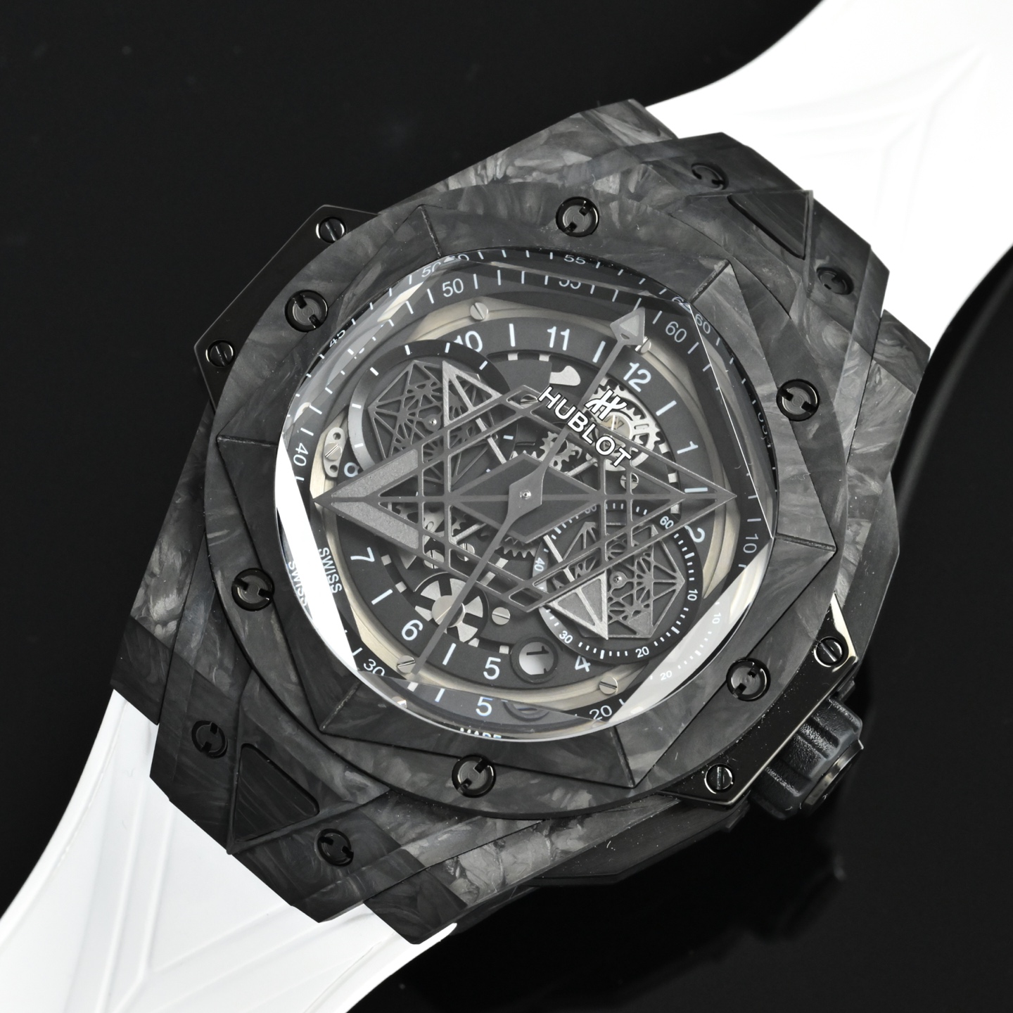 The 45mm case, crafted entirely from carbon fiber, is a testament to Hublot’s innovative spirit. Its matte texture harmonizes with the watch’s hexagonal bezel, secured by six H-shaped titanium screws—a signature of Hublot’s meticulous engineering. The case and bezel geometries are echoed by the bold angular lugs, showcasing an aggressive yet sleek design philosophy that Hublot has perfected over the years.