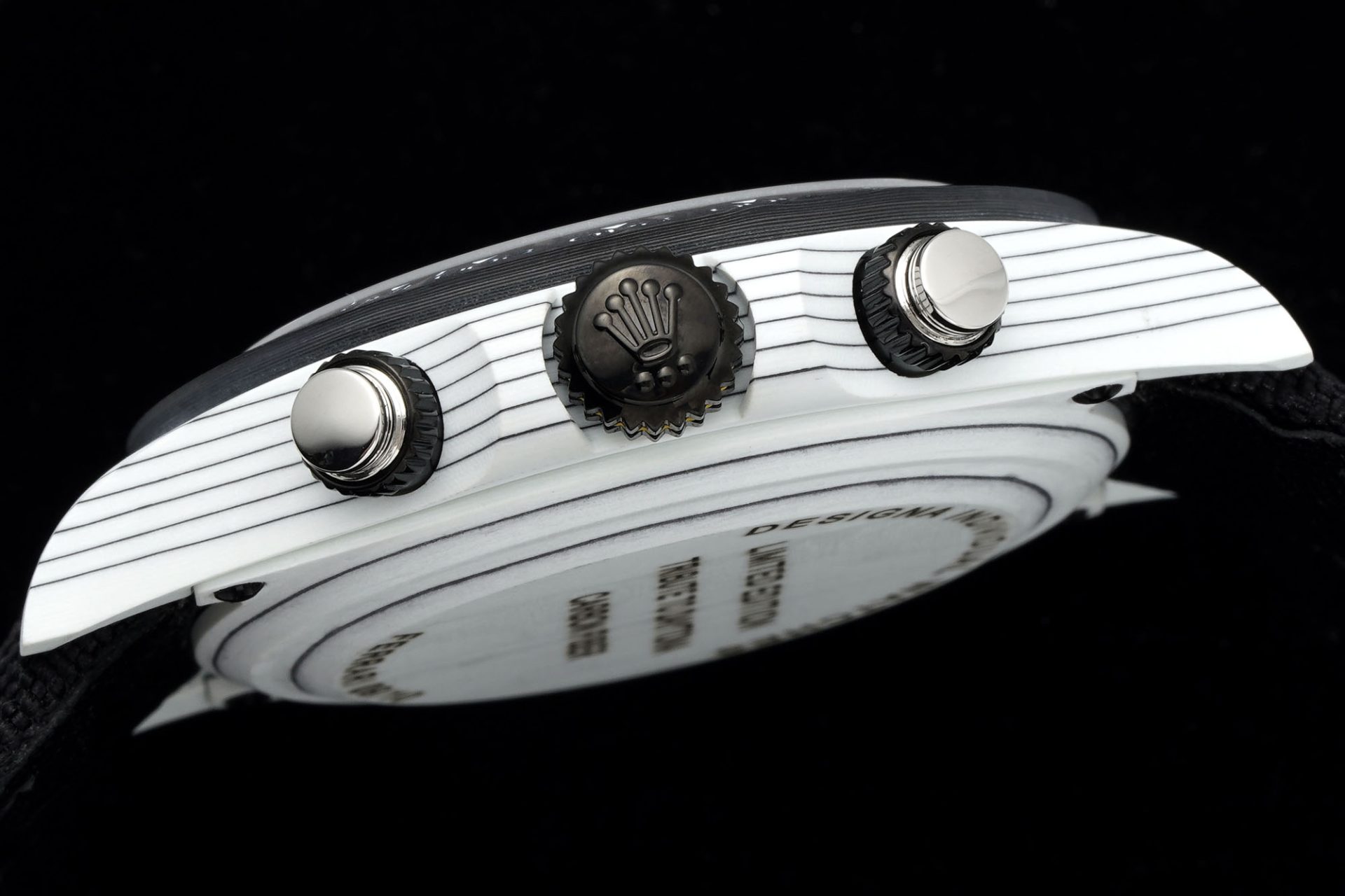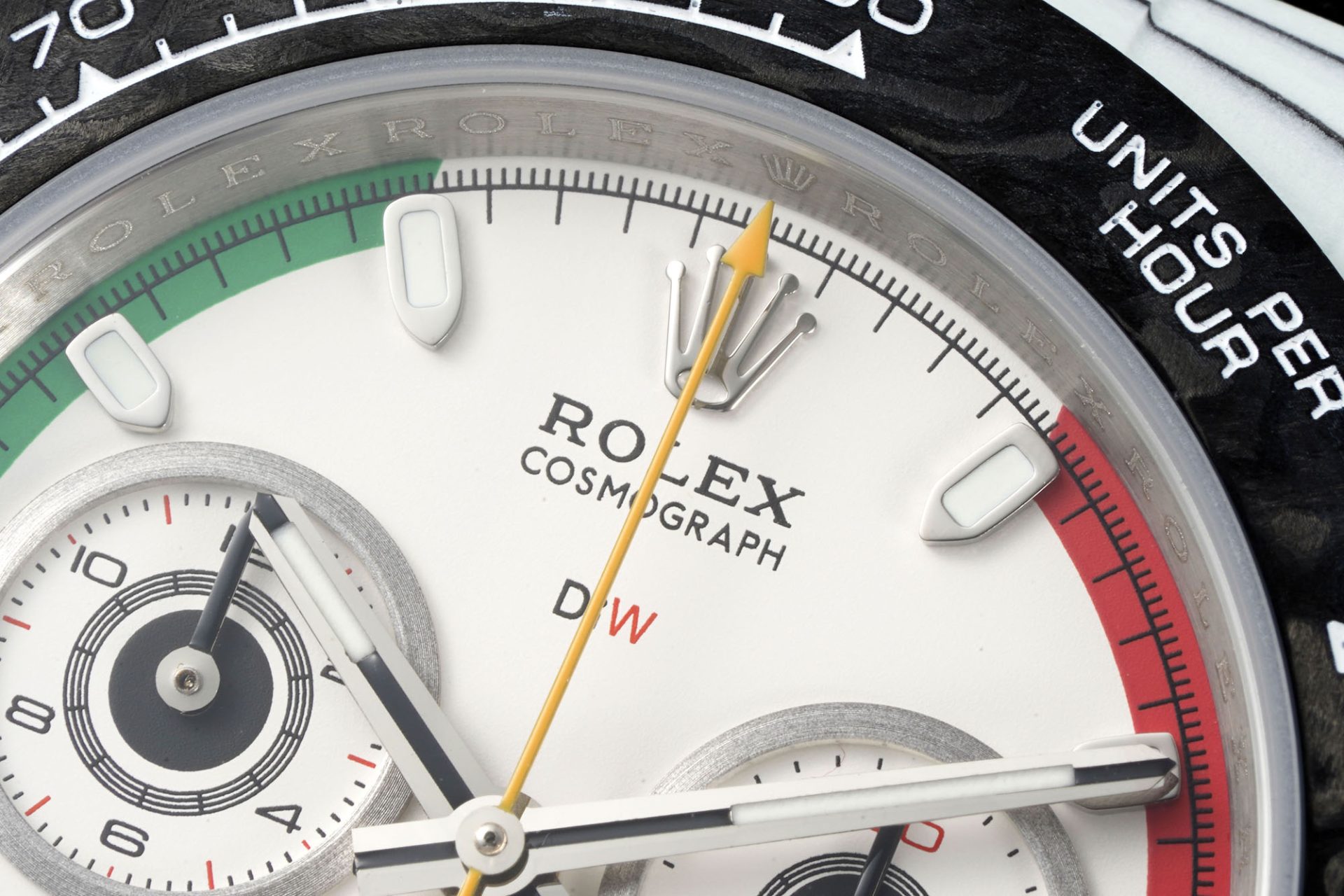 Embracing a 40mm carbon fiber case, the revamped DiW Daytona offers more than a fresh aesthetic. Carbon fiber, prized for its robustness and lightweight qualities, provides a modern and durable alternative to traditional materials. This redesign not only enhances the watch’s visual appeal but also improves the overall wearing experience, offering unprecedented comfort and durability.