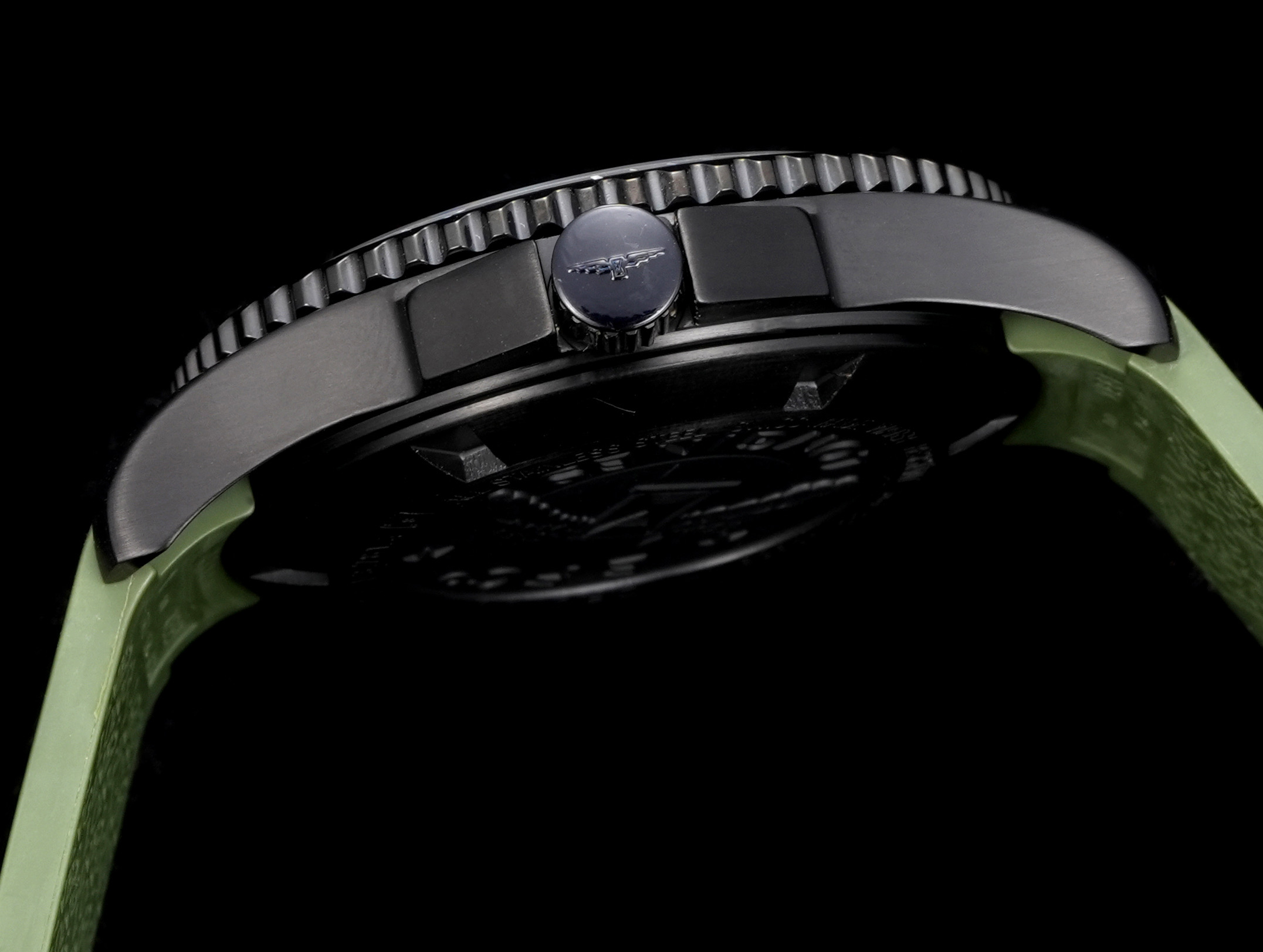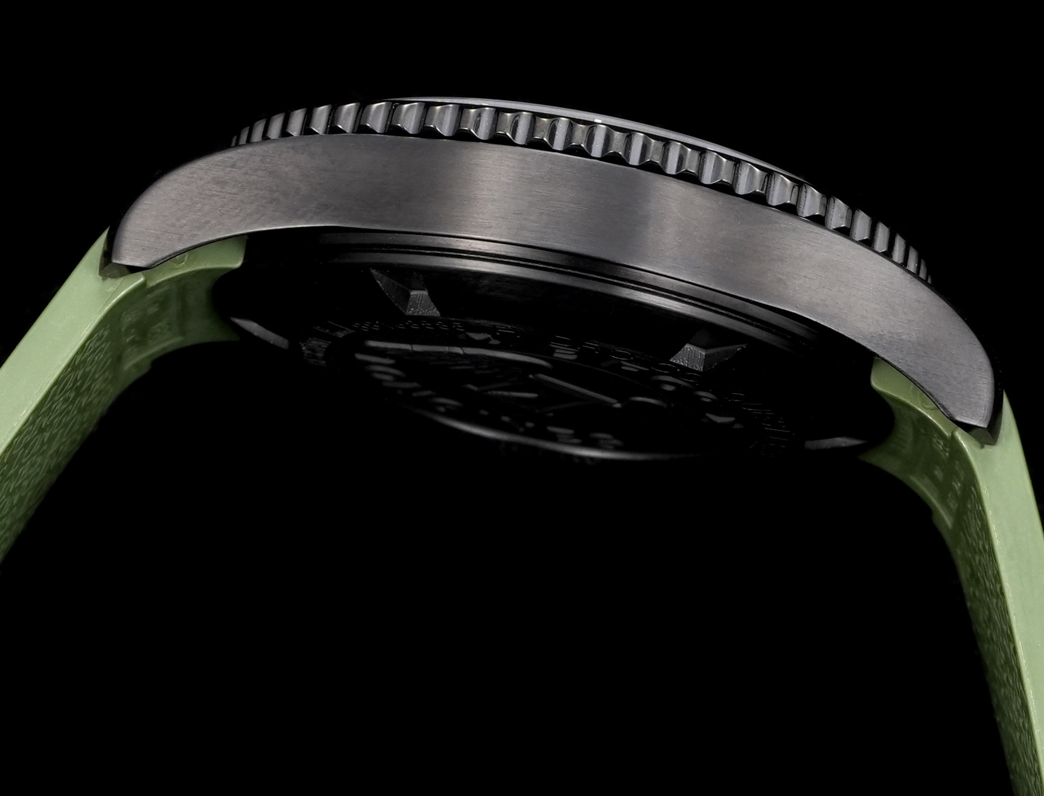 The “Black Knight” is paired with a specially molded rubber strap that adopts a unique curved-end design to ensure a seamless fit against the case. Its clasp is ingeniously adjustable, allowing for easy resizing, a feature that combines form and function seamlessly. This attention to wearer comfort is a nod to the future of watch strap design.