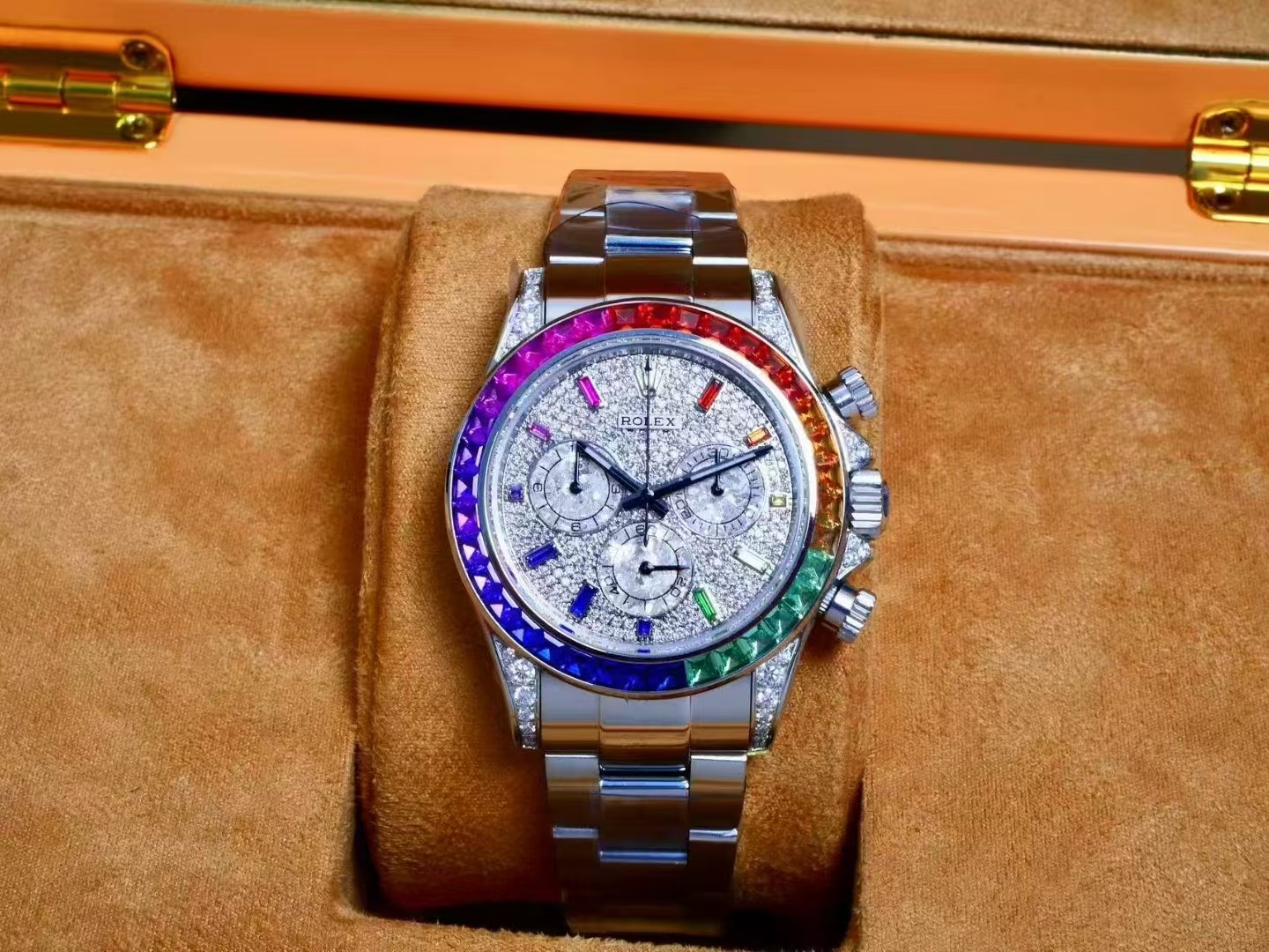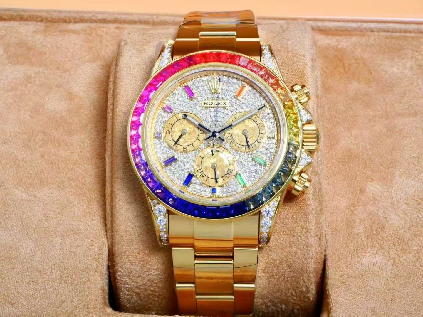 The case design and finish are where RX Customization truly innovates, ensuring that each piece reflects not only the elegance but also the intricacy of the original Daytona. The gold version features straight angles, with head links perfectly aligned with the case, eliminating any protrusions. In contrast, rose and white gold models exhibit gentle upward curves, with head links subtly rising at the front for a refined aesthetic. The cases adorned with diamonds use exclusively Moissanite, ensuring that each piece stands up to close examination without betraying its origins.