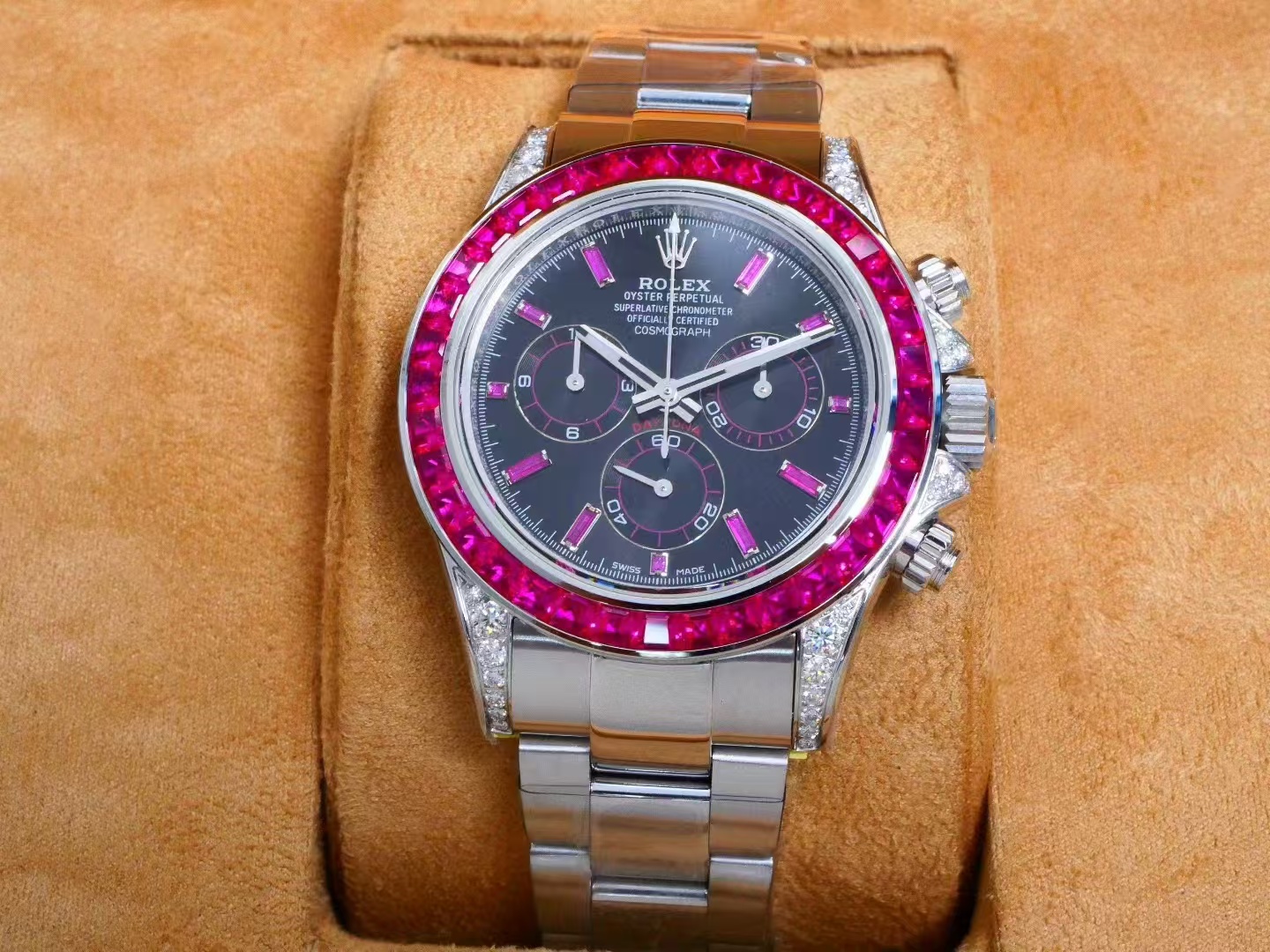 In the realm of watch modification, precision is paramount. RX Customization understands this, painstakingly adjusting the weight of each modified Daytona to achieve an authentic one-to-one replica of the original model. Utilizing steel bracelets, the weight ranges from 206 to 212 grams, while gold variants are subtly lighter at approximately 206 to 210 grams. Due to their composition, diamond-encrusted pieces typically weigh less, as some of the gold components are replaced by diamonds. The meticulous calibration ensures that every watch not only looks but also feels like its Rolex counterpart, thus enhancing the authenticity of the replica watch experience.