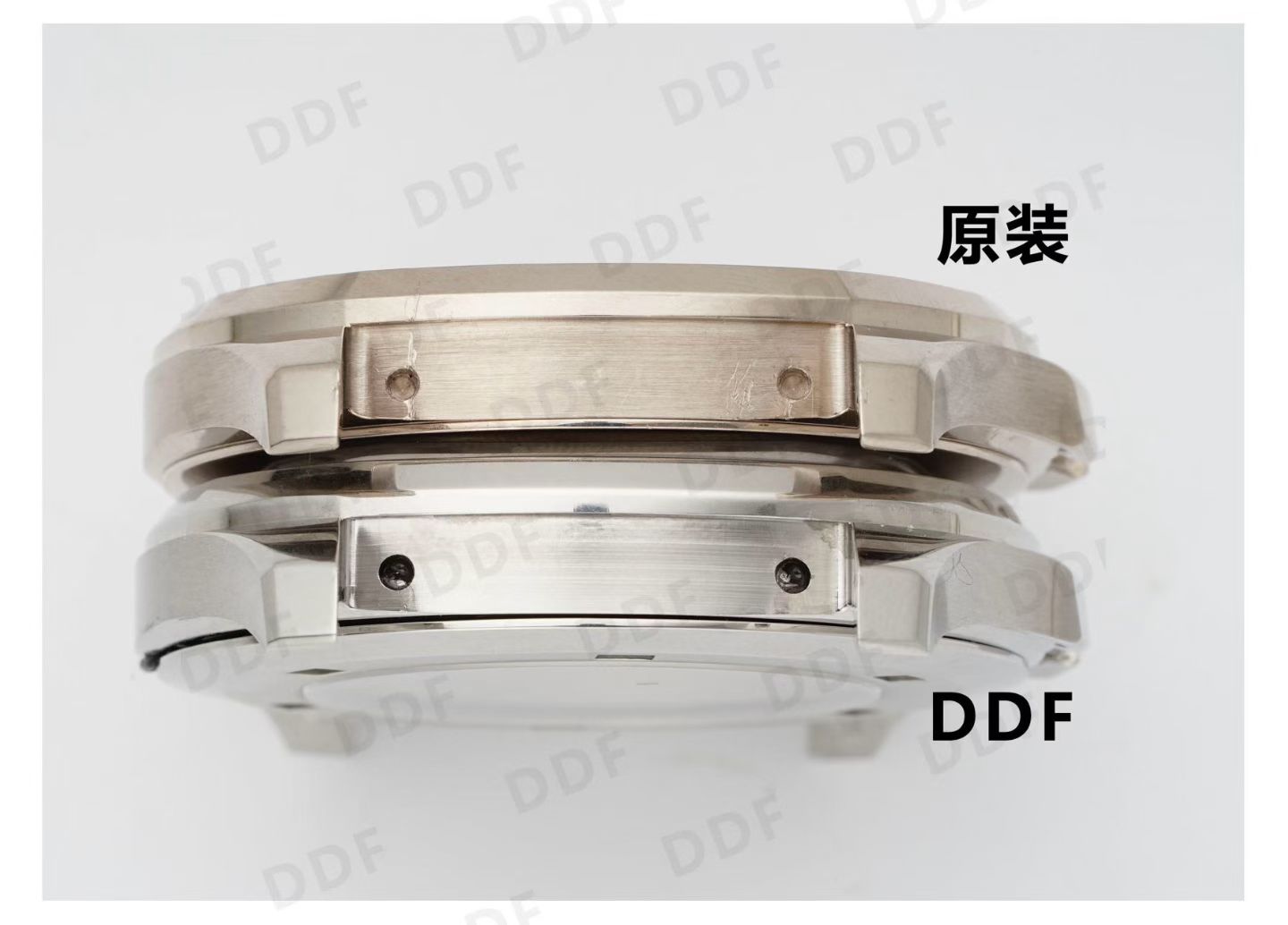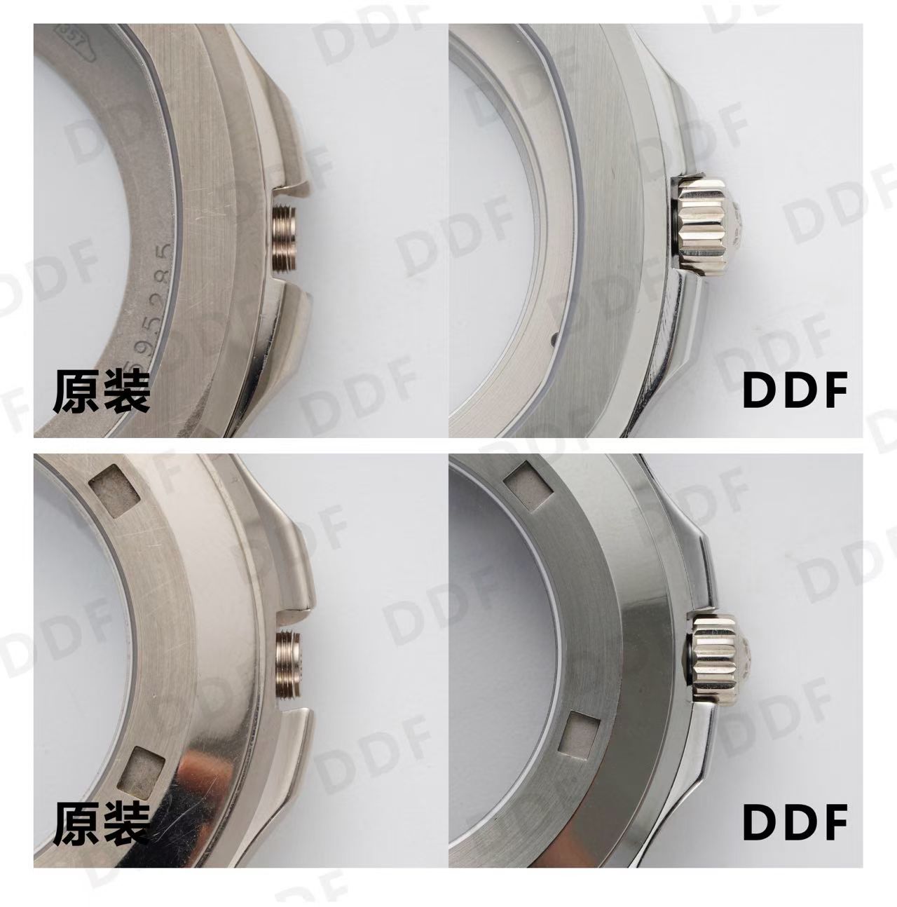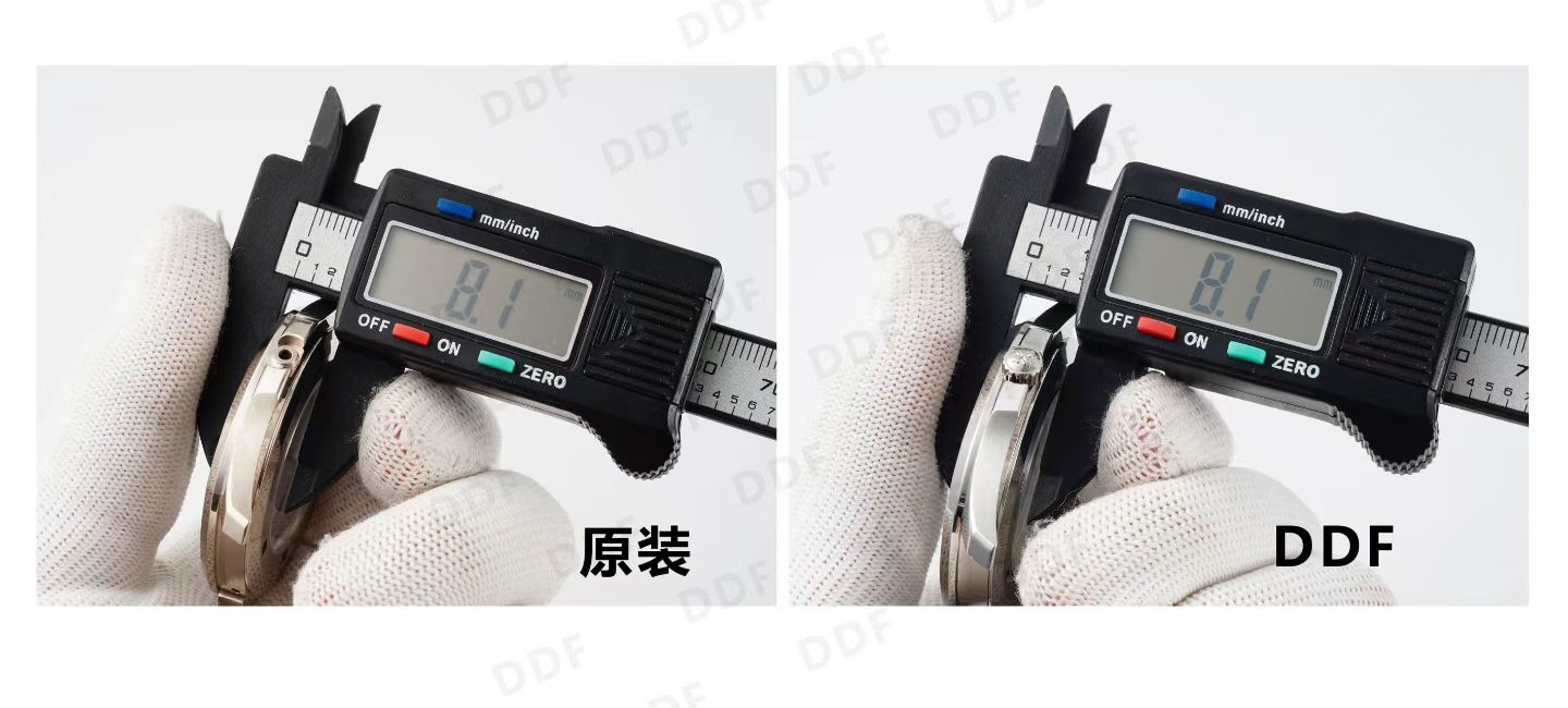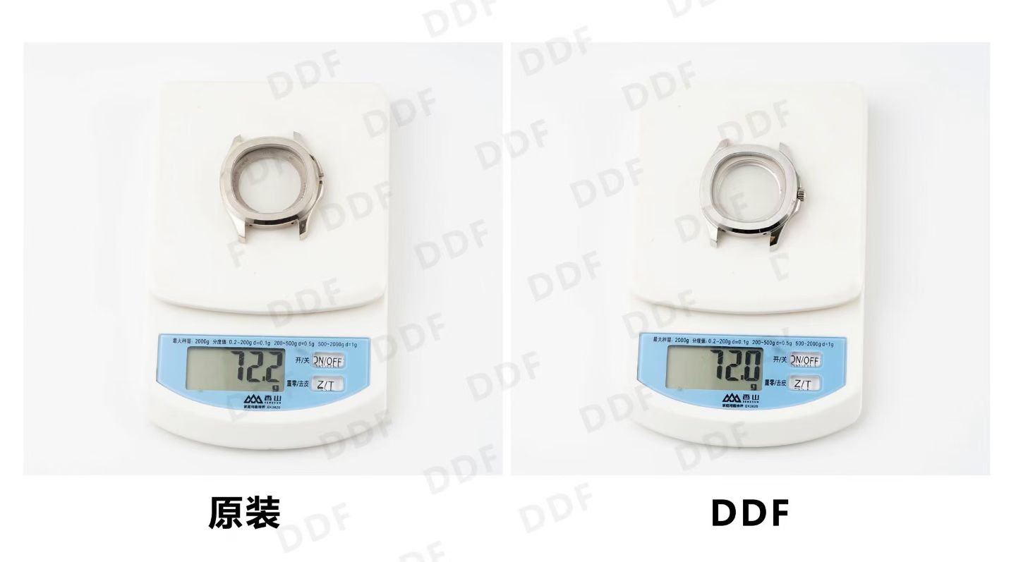 The DDF watch’s exterior pays homage to the original with painstakingly polished and brushed textures, replicating the unique sanded finish of the authentic case. The locking system and crown structure are engineered to fit seamlessly against the case, with internal mechanics echoing those found in high-end market counterparts. At 68 grams, the case maintains the same weight as the original, ensuring that the tactile experience remains unaltered.