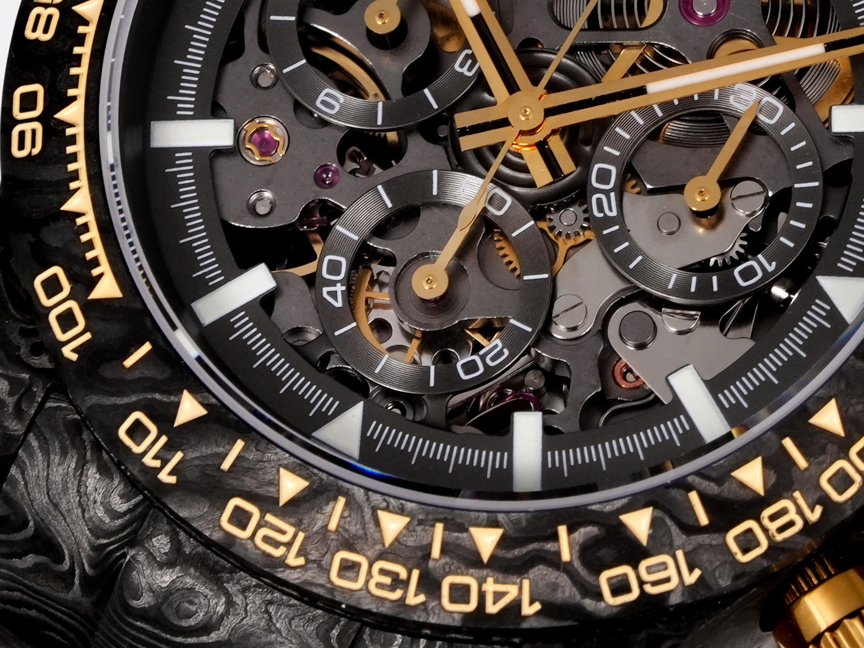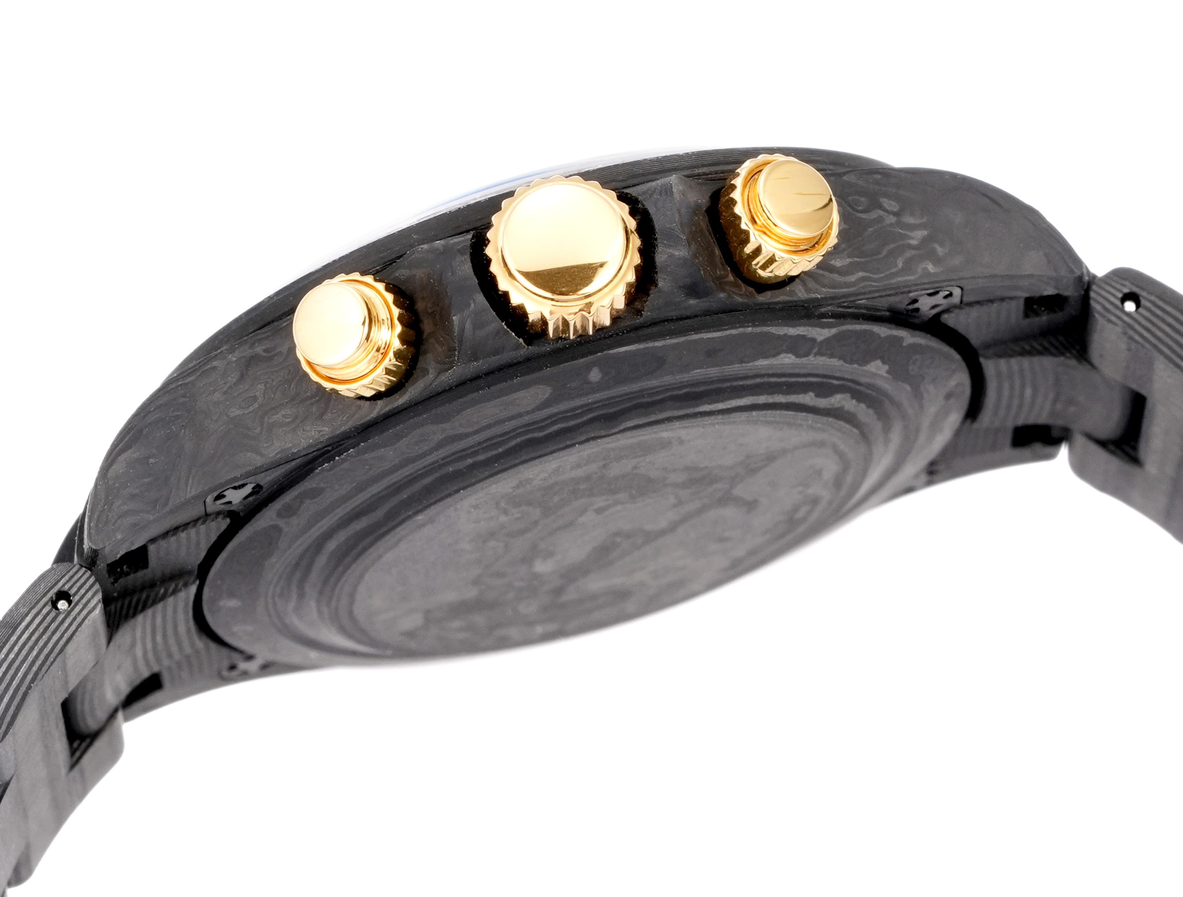 Carbon fiber, known for its lightweight strength and intricate texture, offers a striking contrast to the opulent gold accents of the ‘Gold-Patterned Carbon Shadow.’ TWF REMOULD® has artfully crafted each component, utilizing carbon fiber’s durability as a canvas for gold-crafted crowns, buttons, and hands. This juxtaposition creates a watch that is not only robust but visually arresting, endorsing the motto ‘with carbon as flesh, with gold as blade.’