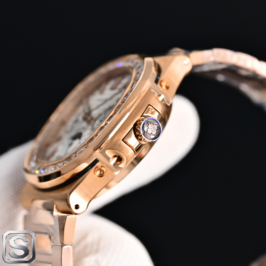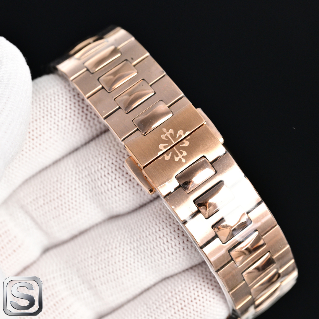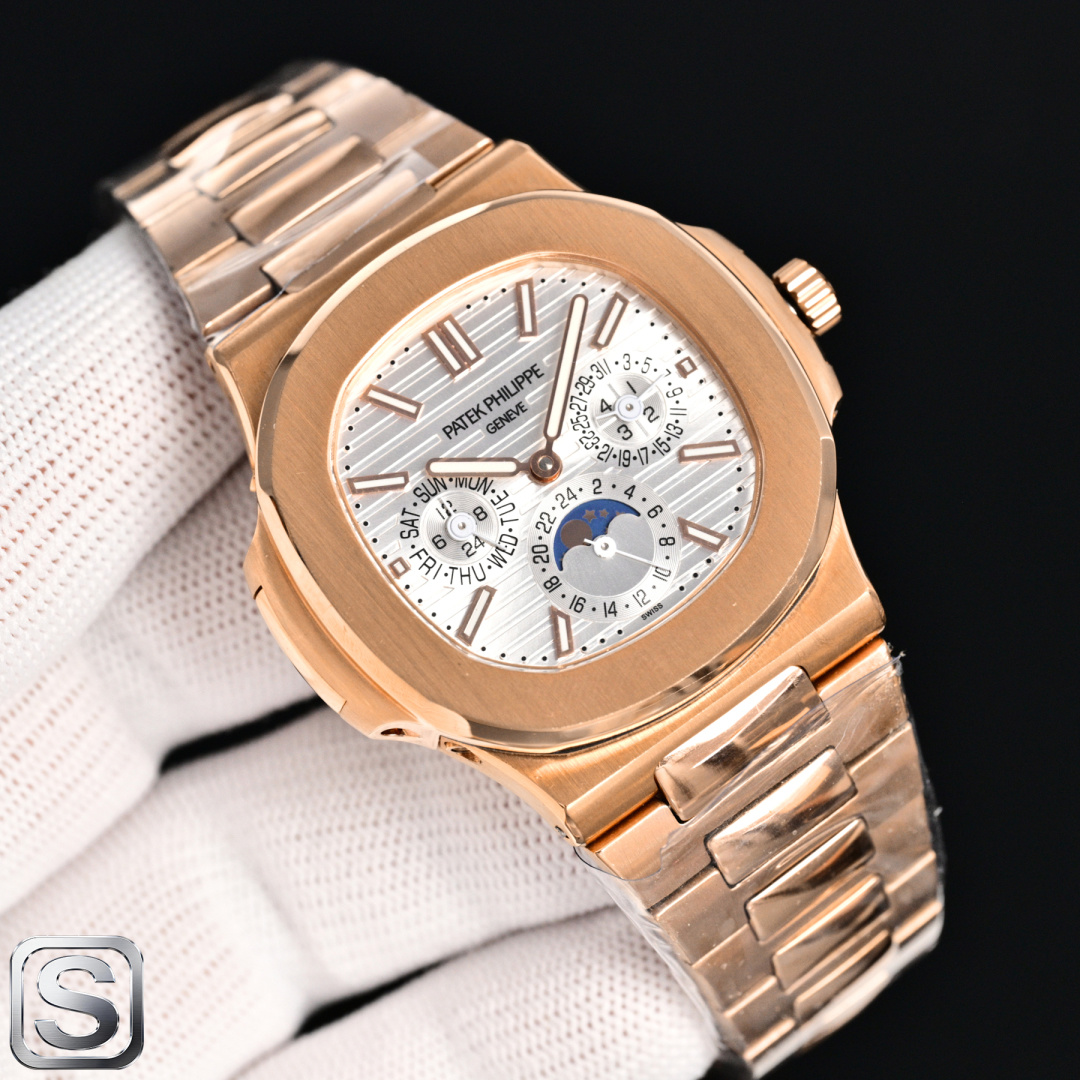At first glance, the Nautilus 5740/1G-001 captivates with its 40mm frame, a modest size housing an array of complex functionalities. The design seamlessly integrates a year display on the left, month display on the right, alongside a day indicator at the 9 o’clock position, a month feature at 3 o’clock, and a refined moon phase and 24-hour manifestation at 6 o’clock. Each element is a testament to meticulous craftsmanship, presenting a harmonious blend of utility and aesthetics.