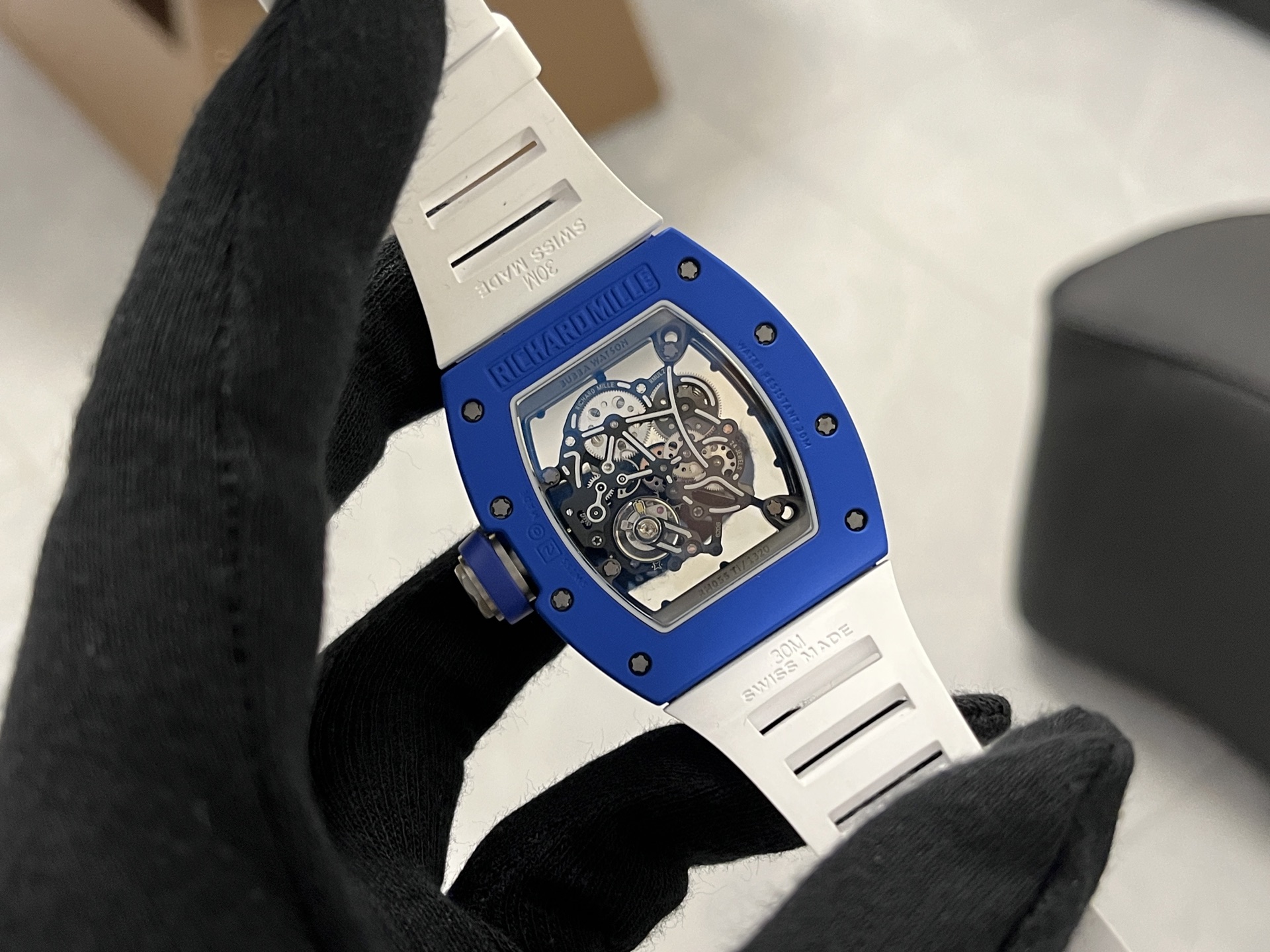 Matching the original dimensions, the RM055 measures 49.90 x 42.70 mm with a thickness of 13.5 mm, ensuring a comfortable and secure fit. Complemented by a sapphire crystal mirror with dual anti-reflective effects, this watch offers clarity and ease of viewing, irrespective of lighting conditions. Moreover, the natural rubber strap completes the design, balancing luxury with comfort—qualities essential for those who wear their watches as both a statement and a utilitarian accessory.