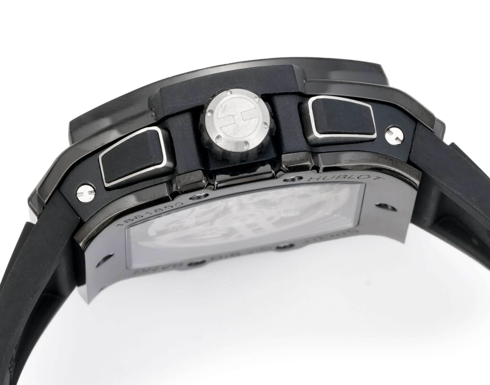 Emphasizing the art of fusion—Hublot’s signature philosophy—this watch features a tonneau-shaped case, a departure from the traditional round forms, crafted from a combination of titanium and resin. This innovative use of materials not only enhances the watch’s visual allure but also provides a lightweight yet robust framework, perfect for those who value both aesthetics and utility. The construction is further fortified through a ‘sandwich’ structure, bolted together with six distinctive H-shaped screws, echoing the sporty and technical spirit of motor racing it draws inspiration from.